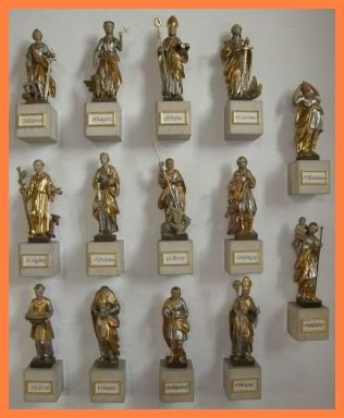 Ihr auserwählten Heiligen, die ihr allesamt mit besonderen Gaben versehen seid. Achatius, du Kämpfer gegen den Zweifel, Ägidius, du Betrachter der Welt, Barbara du Trost der Sterbenden, Blasius du Vater der Armen, Christophorus, du Erretter aus den Gefahren zu Wasser und zu Land, Cyriacus, du Schrecken der höllischen Geister, Dionysius, du Sonne der Gläubigen, Erasmus, du Schild der Verfolgten & Bedrängten, Eustachius, du Helfer in der schwierigen Zeit, Georg, du Beschützer der Schwachen, Katharina, du Wunder der Weisheit, Margareta, du Patronin der Gebärenden, Pantaleon, du Arzt der Kranken, Vitus, du Unterstützer der Jugend.